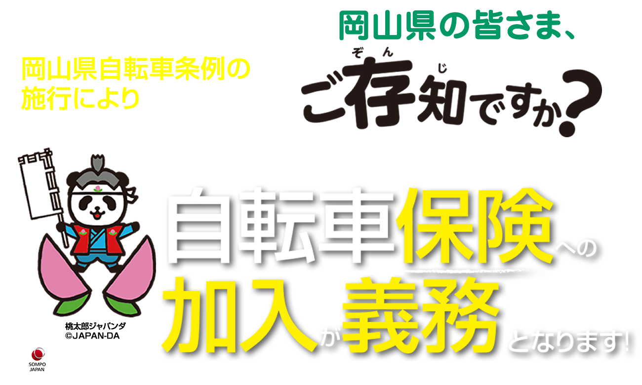 新着情報 2024/4/9 岡山県では、令和6年3月22日に『岡山県自転車の安全で適正な利用の促進に関する条例』が施行されました。 2024/2/1 ご存知ですか!? 自転車の交通ルール 2022/4/7 便利な口座振替でのご加入もできます! 2020/12/10 ホームページを開設しました。 2020/12/9 岡山市と事業連携協定を締結